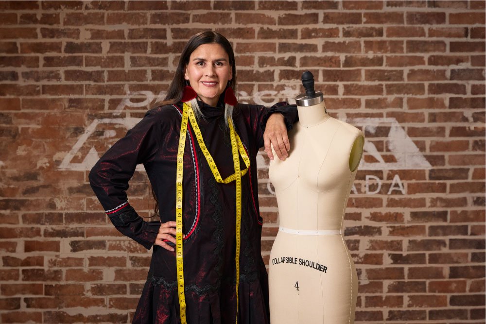 Rooted in Inuvialuk and Gwich’in traditions, Taalrumiq brings her ancestral sewing knowledge into modern design. Her pieces weave together cultural storytelling and couture craftsmanship.