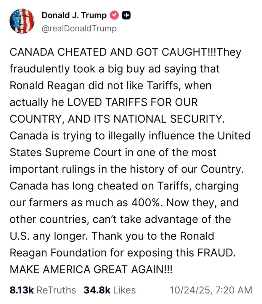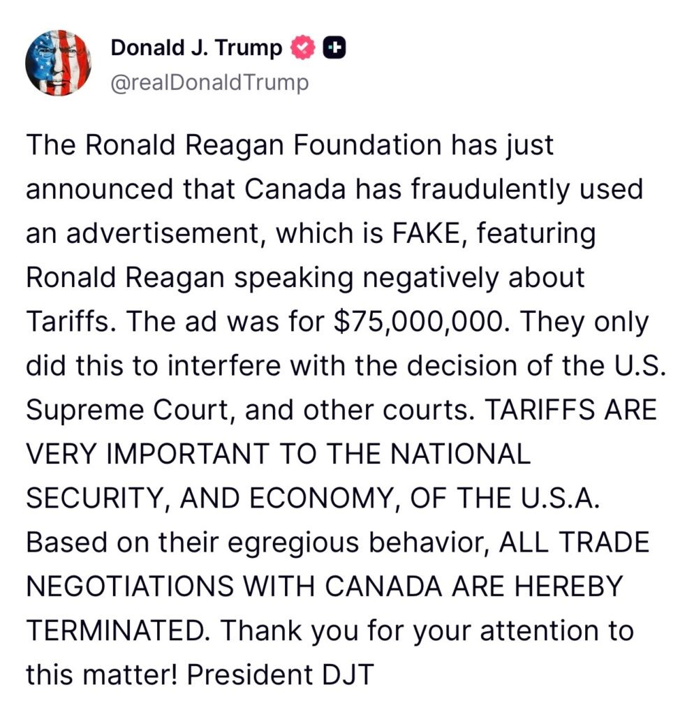 Trump reacted via social media: “The Ronald Reagan Foundation has just announced that Canada has fraudulently used an advertisement … featuring Ronald Reagan speaking negatively about tariffs.”